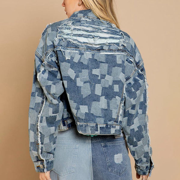 Plaid Raw Hem Dropped Shoulder Denim Jacket