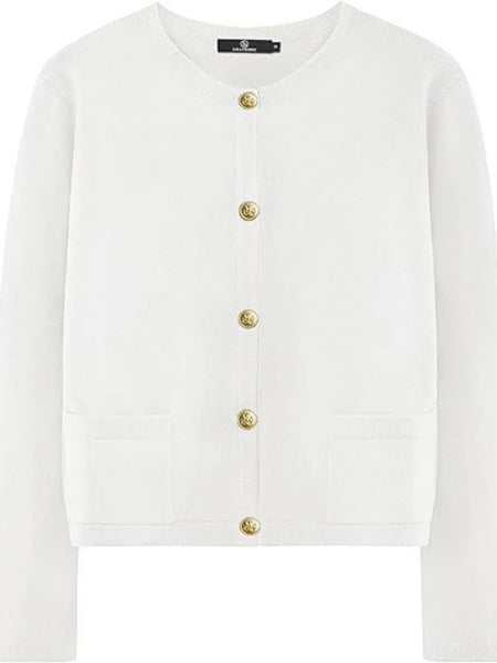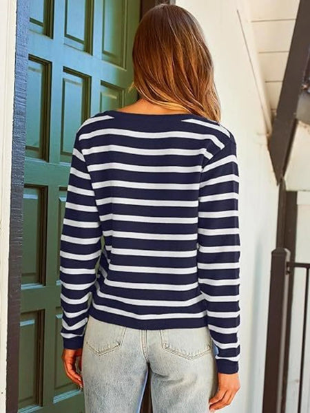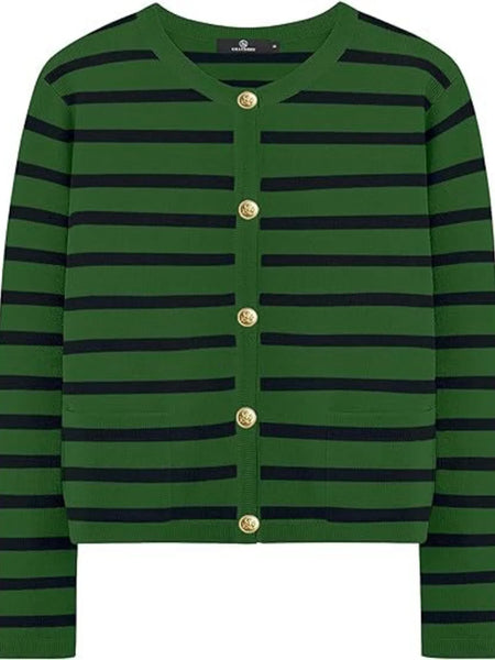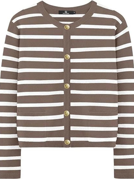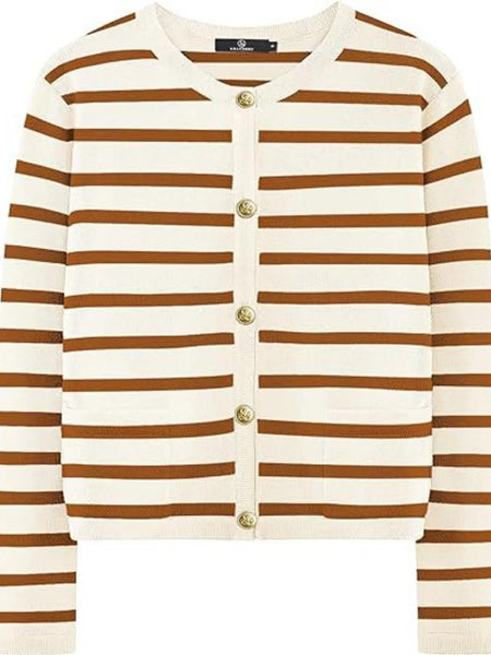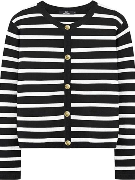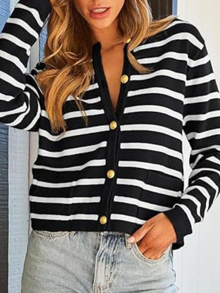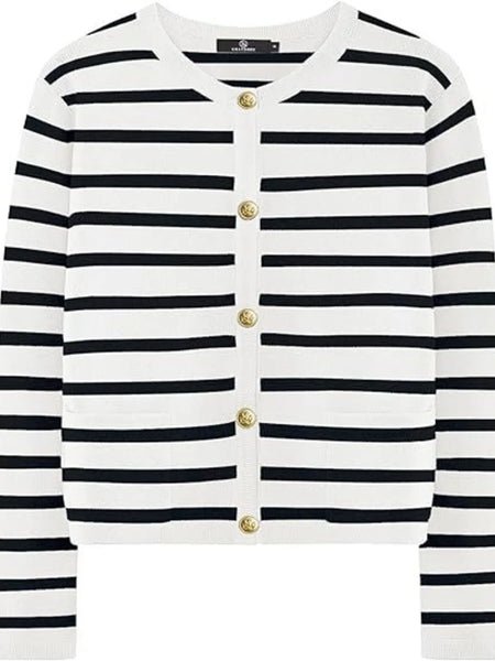 This elegant striped button-up cardigan features a timeless black and white horizontal stripe pattern that adds classic sophistication to any wardrobe. Crafted from soft, lightweight knit fabric with comfortable stretch, it offers excellent wearability and easy care maintenance. The cardigan showcases distinctive gold-tone buttons that create an elegant contrast against the monochrome stripes, while the flattering V-neck design and relaxed fit provide versatile styling options. Perfect for layering over tanks, tees, or dresses, this piece transitions seamlessly from casual to semi-formal occasions. The ribbed cuffs and quality construction ensure durability and shape retention, making it an essential wardrobe staple for year-round wear.