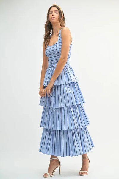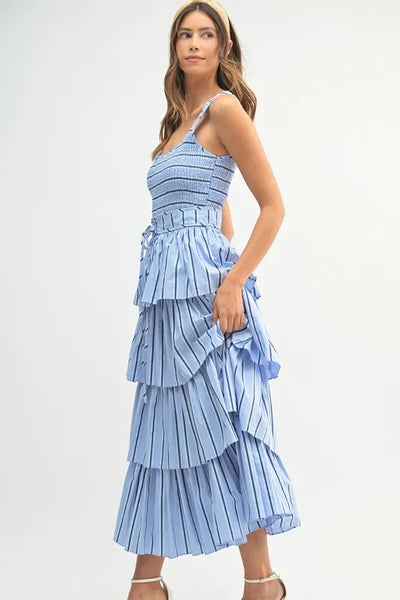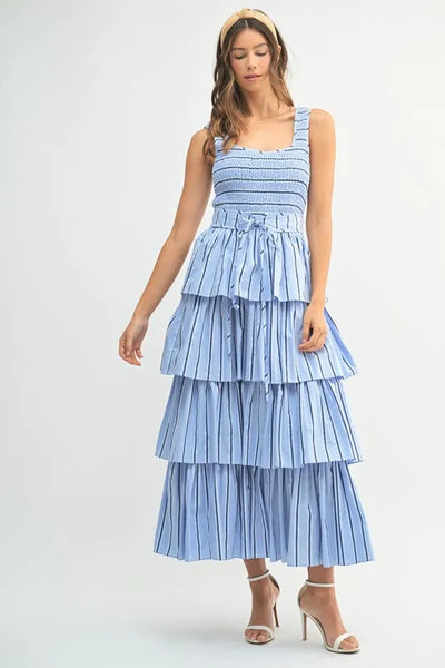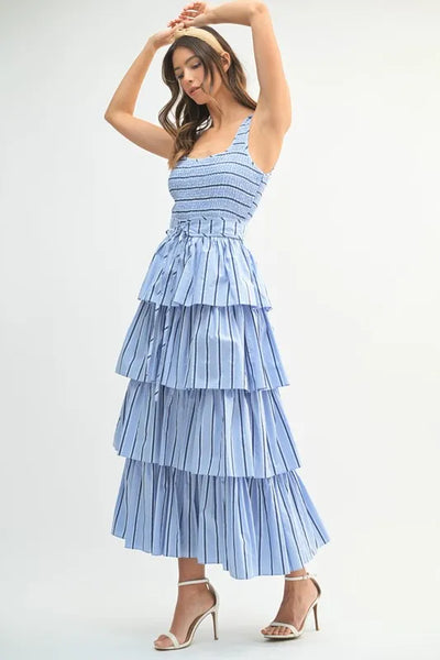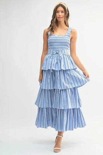 Pin Stripe Smocked Bodice Layered Midi Dress