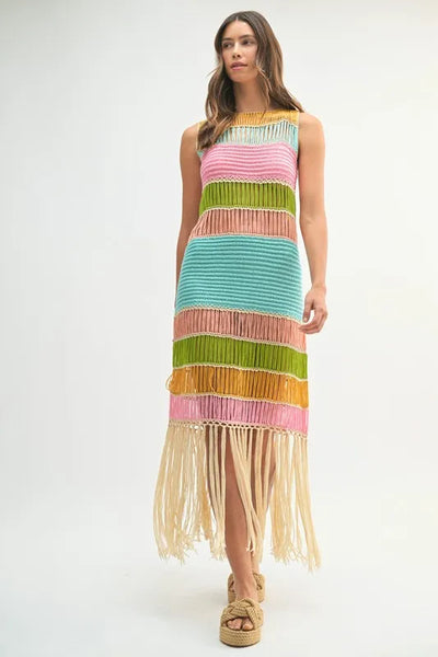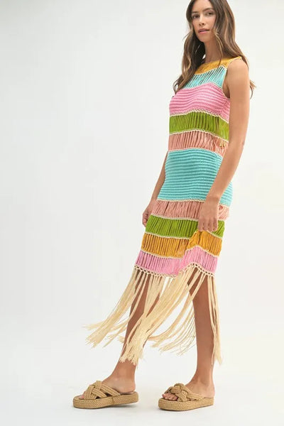 The multi-color fringed crochet knit dress is a vibrant and eye-catching piece featuring a variety of colors and fringe accents. The crochet knit design adds texture and visual interest to the dress, creating a unique and playful look. Perfect for festivals, beach parties, or summer events, this dress offers a bohemian and fun style that is sure to make you stand out and express your individuality.