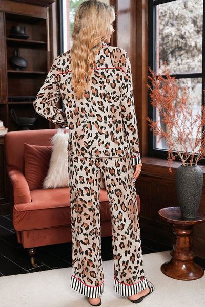 Khaki Leopard Print Colorblock Striped Patchwork Shirt and Pants Pajama Set