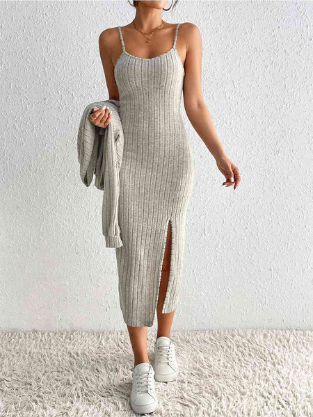 Ribbed Spaghetti Strap Slit Dress & Cardigan Set